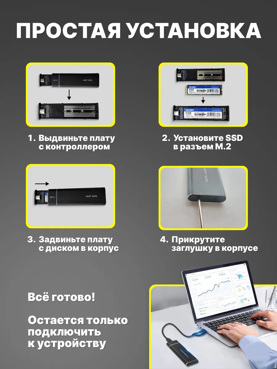 Установка SSD в бокс производится быстро и без лишних усилий. Простая конструкция позволяет даже новичкам без труда заменить или установить жесткий диск всего за несколько минут.